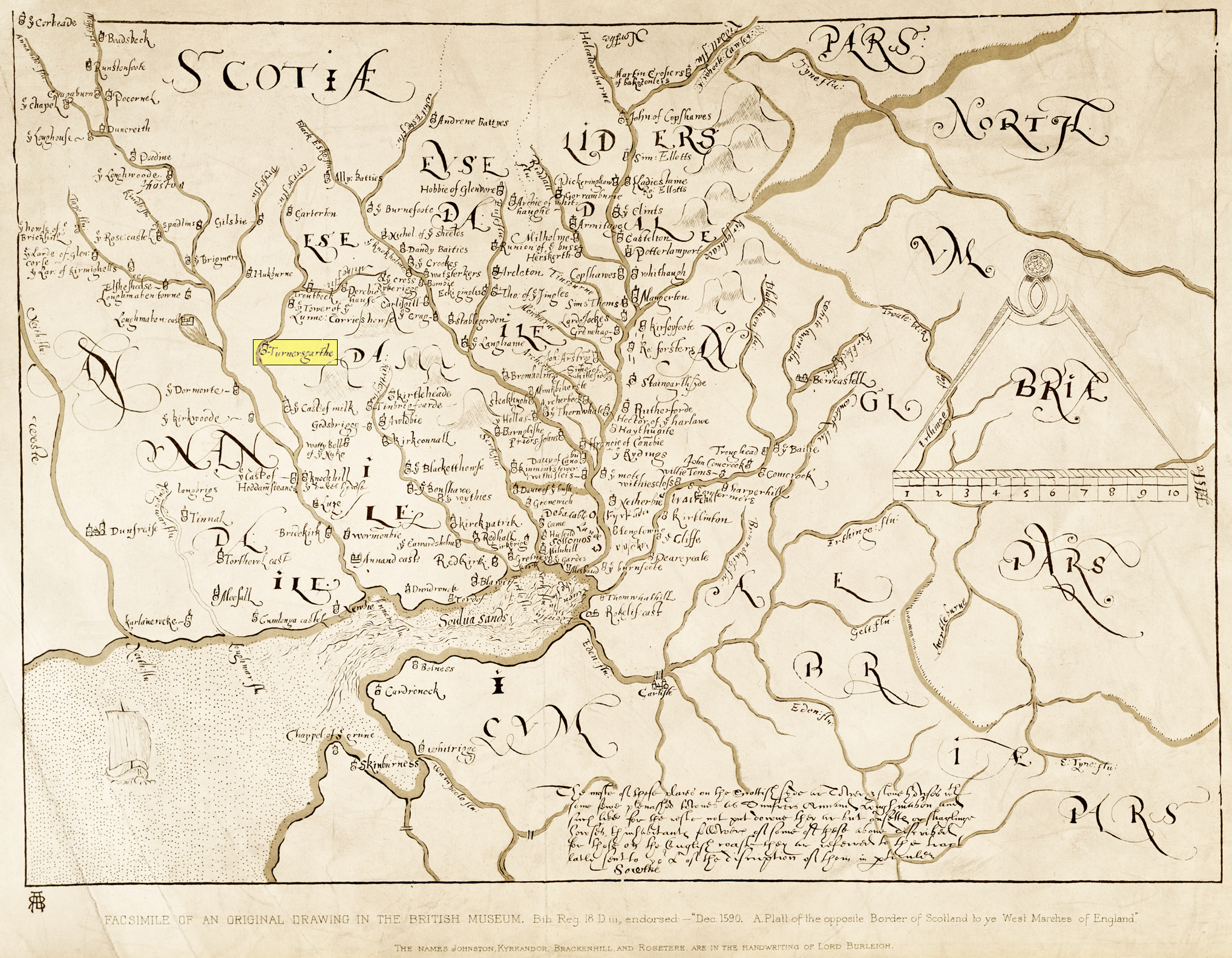 1590 Map showing the Johnston castle on the Milk River called Turnersgarthe, also known as Tundergarth